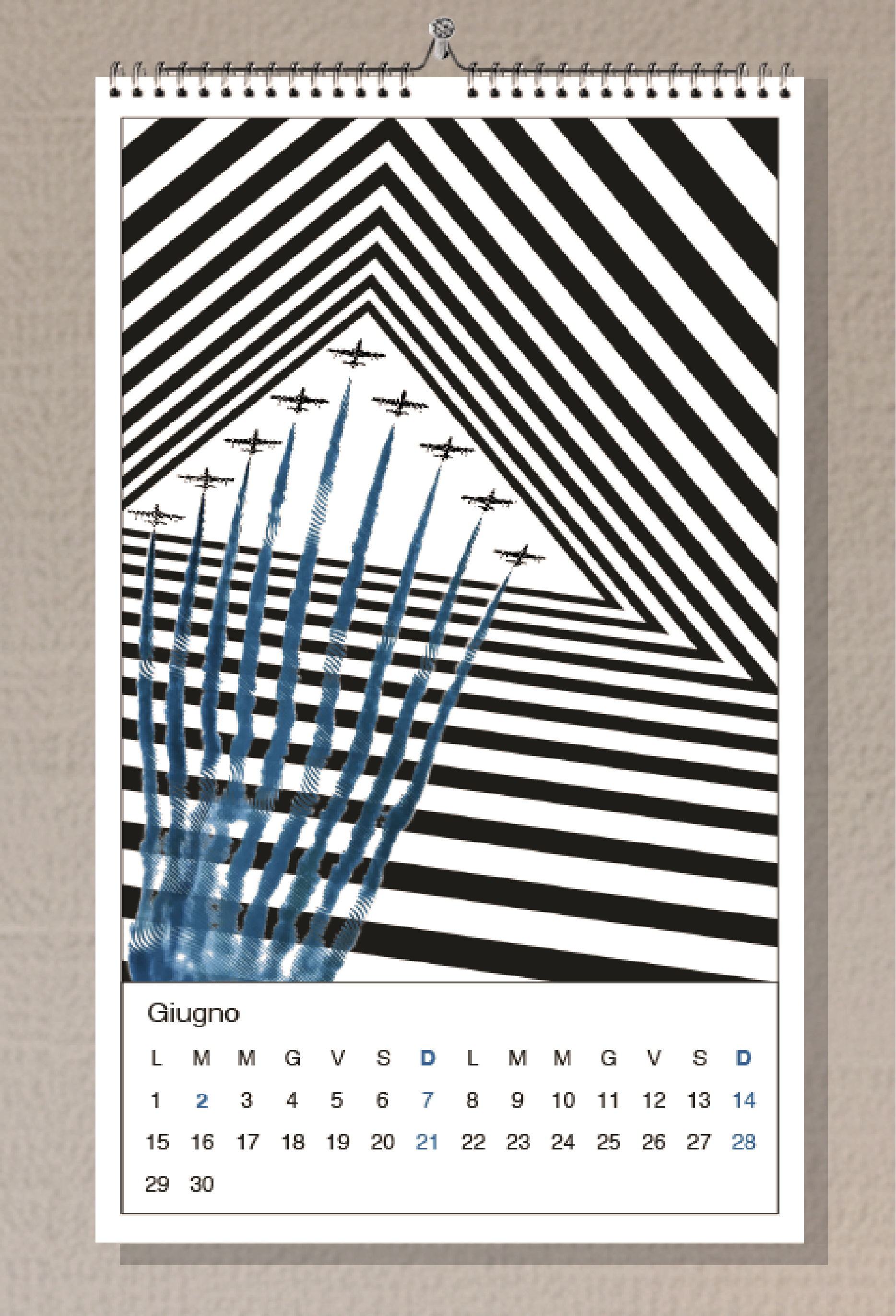 Un’Optical Art dinamica segue il movimento delle frecce, evocando la Festa della Repubblica. Il blu, colore del mese, richiama l’identità degli Azzurri e il senso di appartenenza nazionale.