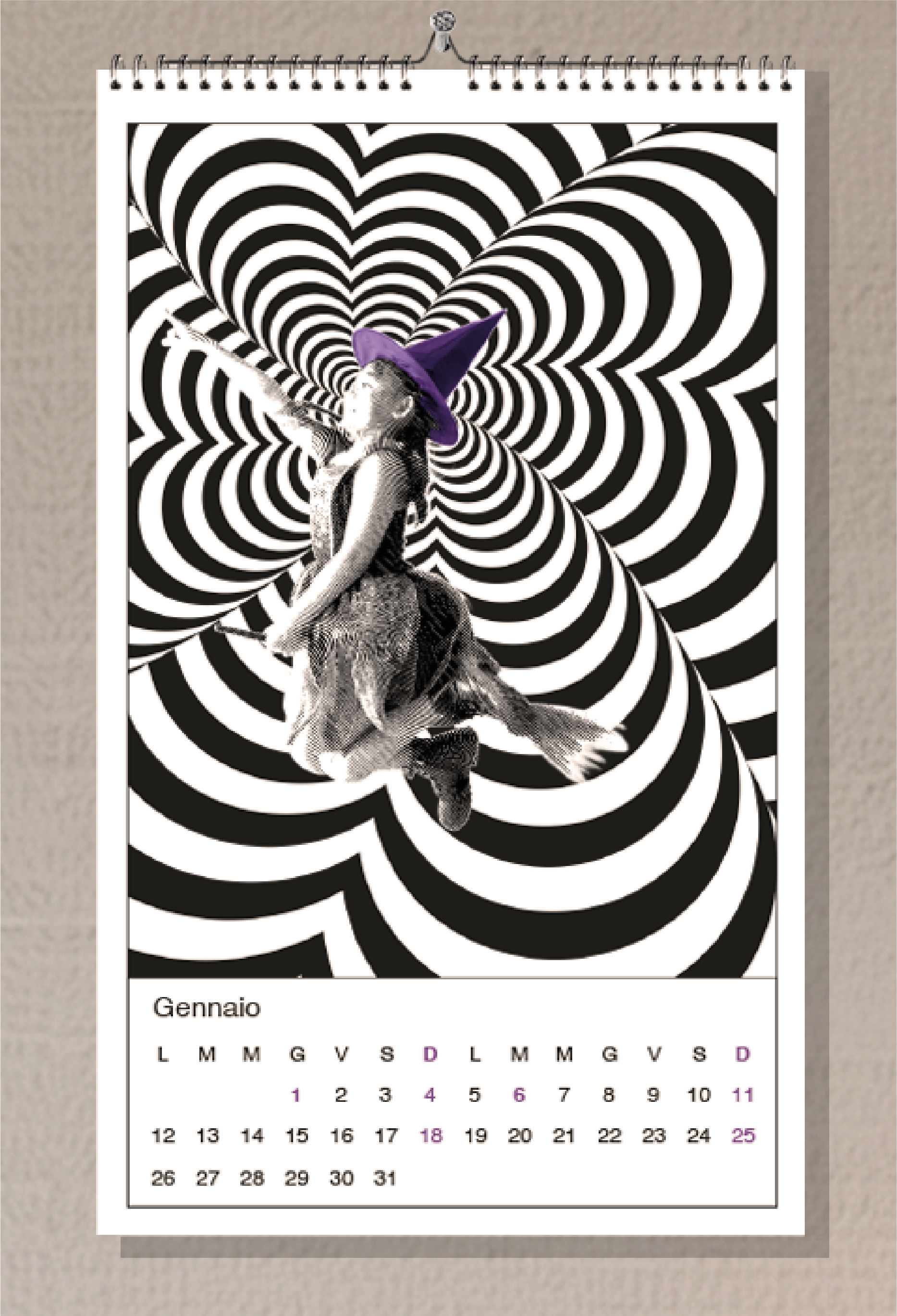 Un’Optical Art morbida, ispirata alla leggerezza delle nuvole, accoglie una figura in volo che richiama l’immaginario dell’Epifania. Il viola, colore del mese, avvolge la scena in un’atmosfera sospesa e suggestiva.