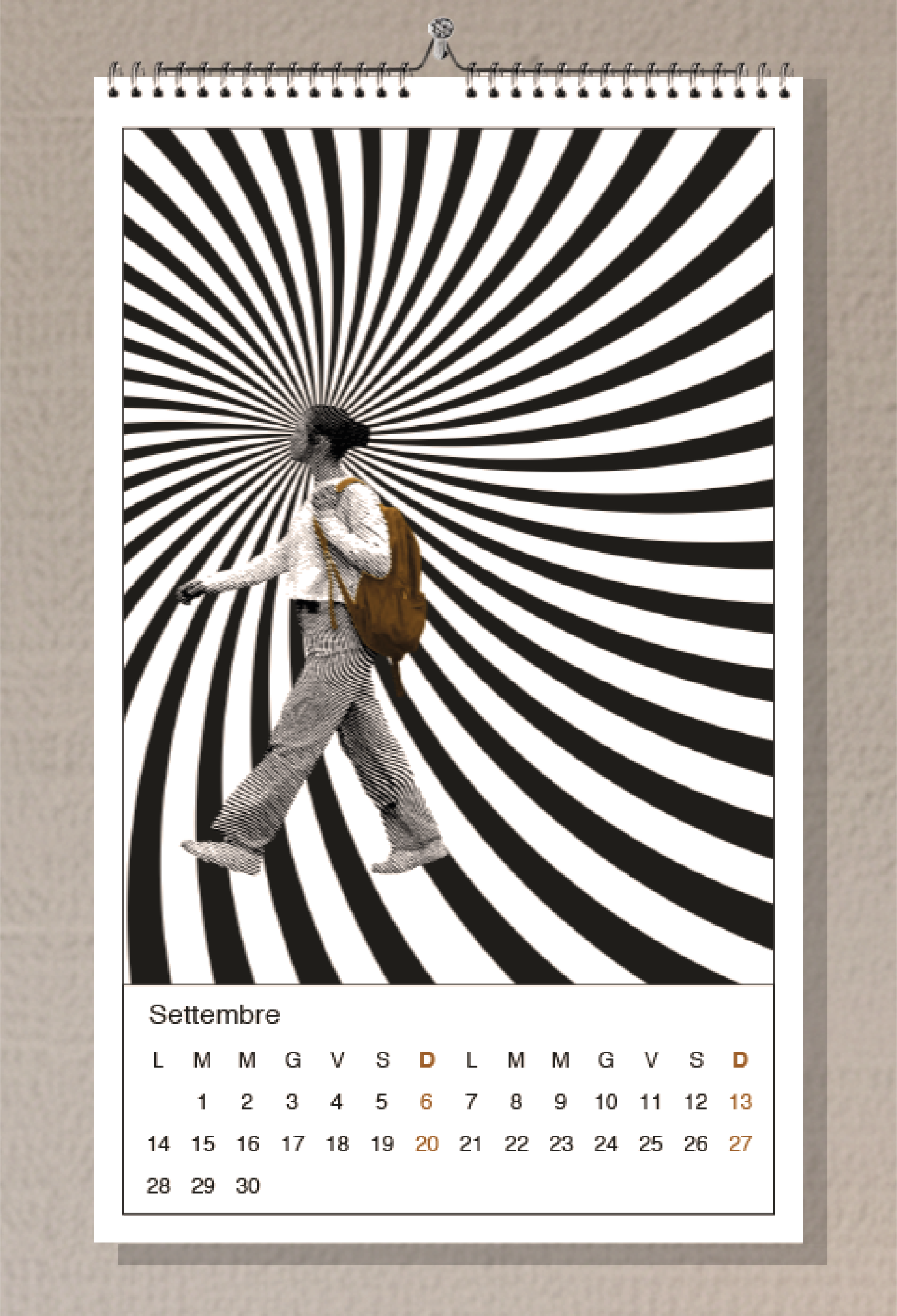Linee curve in Optical Art creano un’atmosfera riflessiva, accompagnando una figura che richiama il ritorno alla quotidianità. Il marrone, colore del mese, esprime stabilità e transizione verso nuovi inizi.